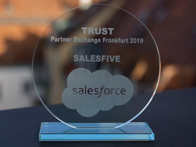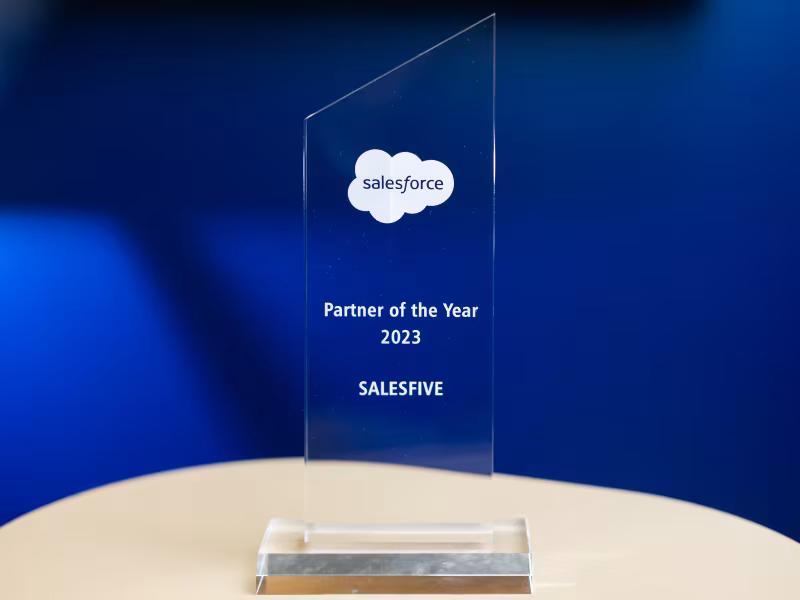 Die Partner-des-Jahres-Auszeichnung ist die höchste Ehrung, die Salesforce einmal im Jahr an seine Partner vergibt. 2023 erhielt Salesfive diese Auszeichnung für herausragendes Engagement und konsequent hohe Qualität über mehrere Jahre hinweg.